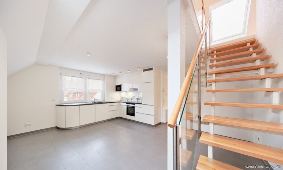 Ein architektonisches Highlight bildet die hochwertige Treppe mit Glaselementen. Sie verbindet beide Ebenen elegant miteinander und unterstreicht die moderne, offene Gestaltung dieser besonderen Wohnung.
